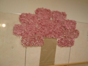 小さくカットした布を段ボールに埋め込んで桜の花を作っています。
