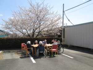 グループホームしあわせ🌸お花見ランチ 2026/03/31 施設の桜の木が満開になると毎年外で昼食やお茶会をします。 今年は満開の桜の下でランチをしました。 暖かい日差しの中で、皆さんも笑顔を見せてくださいました。 カテゴリ│お食事等, しあわせ日記, レクレーション タグ│